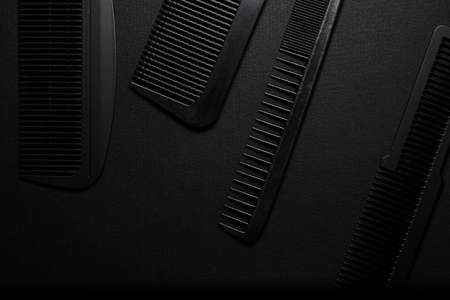 On a black surface are old barber tools. barber tools. four comb. black monochrome. frame. top view flate lay.