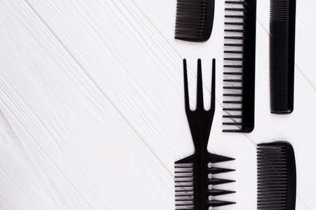Set of black plastic combs for hair coloring. Set of professional hairdresser tools and copy space. Beauty salon and hairdressing concept.