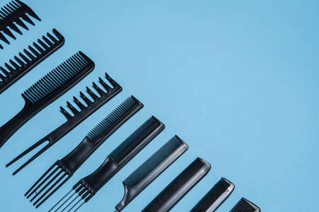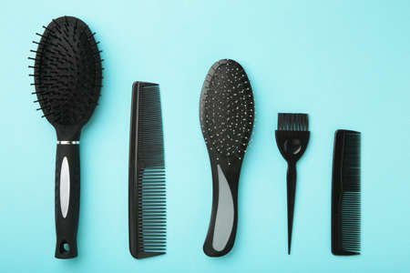Hair tools, beauty and hairdressing concept - different brushes or combs on blue background. Top view