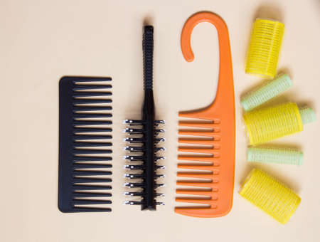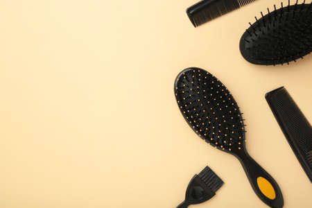 Hair tools, beauty and hairdressing concept - different brushes or combs on beige background. Top view