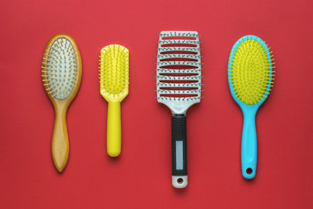 A set of multi-colored massage combs on a bright red background. Accessories for hair care. flat lay.