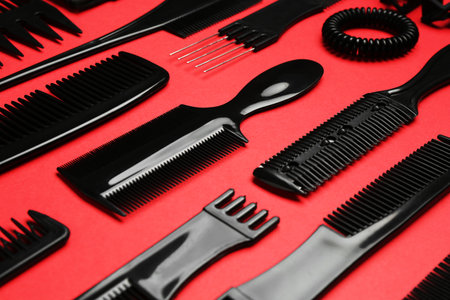 Different hairdresser's tools on red background, closeup