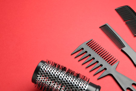 Different hairdresser's tools on red background, closeup. Space for text