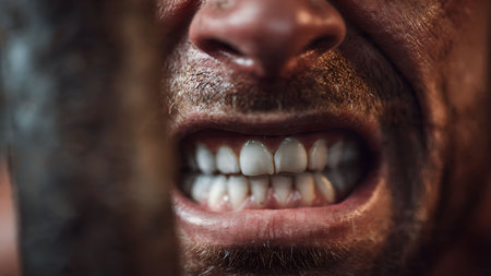 Close-up of an angry man clenching his teeth. Concept of aggression, frustration, and emotional stress.