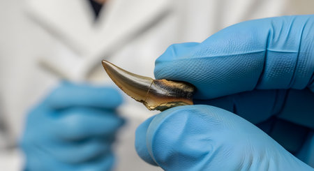 A close-up shot of a paleontologist's hand in a blue nitrile glove holding a sharp, curved, fossilized tooth. The tooth shows distinct coloration and a crack down the middle, indicating its age. The background is blurred, focusing attention on the scientific specimen.