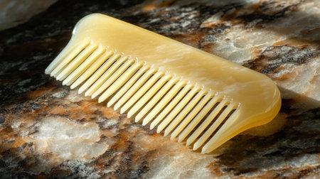 Close-up view of a yellow comb resting on a marble surface, illuminated by soft lighting. This image captures the beauty of everyday grooming tools in an artistic manner.