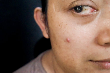 Asian woman with pimple and freckles and spots on her cheek and eye