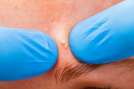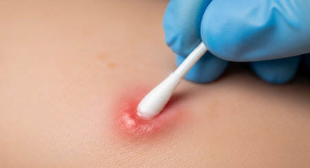 Doctor with blue glove treating a pimple on skin with cotton swab. Acne treatment and dermatology concept. Skin care for teen problem.