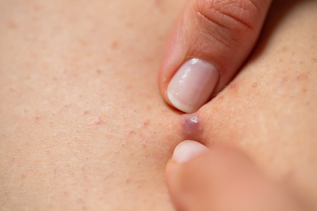 Close up picture of folliculitis on female skin - hands squeezing the infected follicle, painful