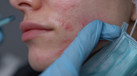 This close-up image captures a treatment session focused on acne care, highlighting skincare and professional technique with a gloved hand and a patient.