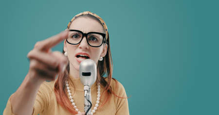 Aggressive vintage style woman giving a speech on a microphone and pointing at camera