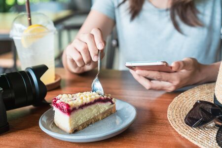 Close up of women's hands holding mobile phone while eatting cake in cafe.