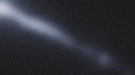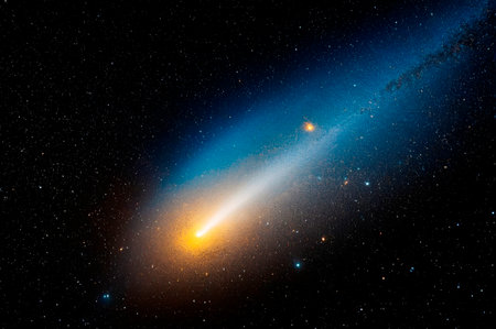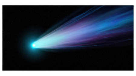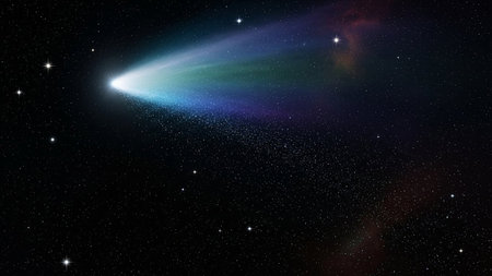 Close-up of comet tail with bright colors and a glowing head, leaving a sparkling trail in its wake.
