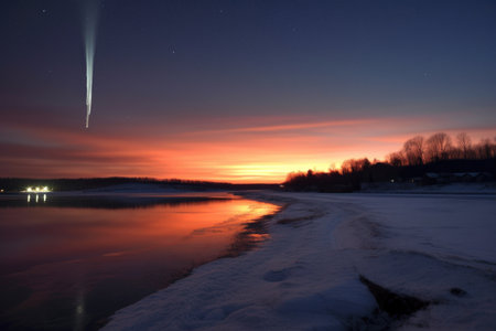 A breathtaking comet streaks across the night sky, its tail a vibrant spectacle against the backdrop of stars and a setting sun.