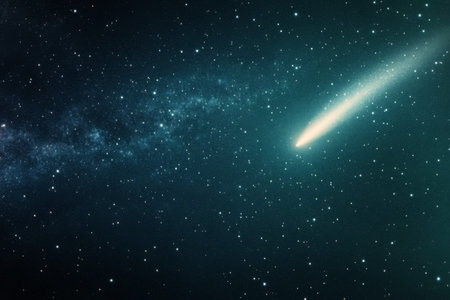 A brilliant comet with a glowing tail moves through a vast expanse of stars, illuminating the dark sky. This celestial event captivates stargazers in the night.