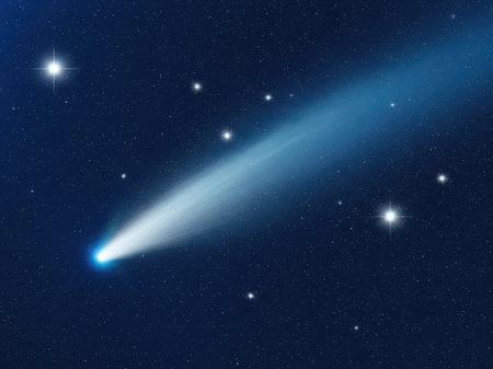 A comet with a dazzling tail stretching across the sky, the bright head illuminating stars in the background.