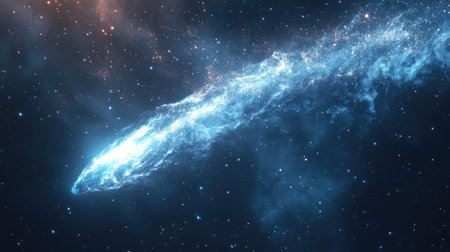 A brilliant comet illuminates the vast darkness, leaving a luminous trail against a deep blue backdrop. The scene presents a sharp contrast between light and shadow. Ideal for various applications, this image can be used for editorial purposes or to enhance creative projects. The composition emphasizes celestial elements.