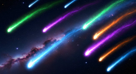 A spectacular meteor shower fills the night sky with vibrant colors, as streaks of glowing light dance across the dark canvas. Viewers marvel at this celestial display in awe.