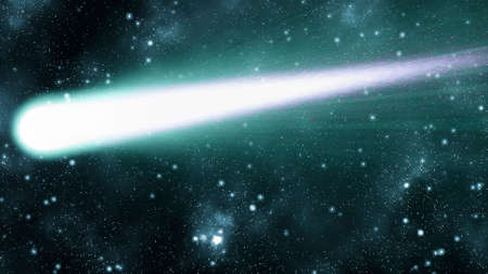 A comet with a dazzling tail stretching across the sky, the bright head illuminating stars in the background.