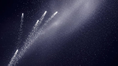 A brilliant comet illuminates the vast darkness, leaving a luminous trail against a deep blue backdrop. The scene presents a sharp contrast between light and shadow. Ideal for various applications, this image can be used for editorial purposes or to enhance creative projects. The composition emphasizes celestial elements.