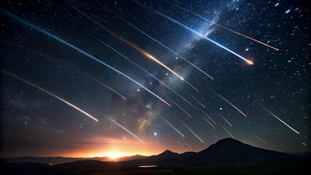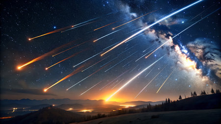A surreal shot of a meteor shower streaking across the night sky, with bright trails of light cutting through the darkness like celestial fireworks. ai
