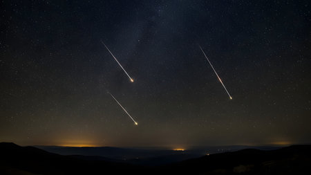 A breathtaking night sky filled with stars and bright shooting stars trailing over a dark mountain silhouette. The cosmic scene depicts a meteor shower illuminating the vast universe above a quiet landscape.