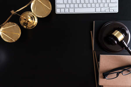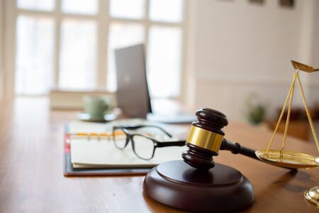 Law theme, mallet of the judge, justice scale, wooden desk background