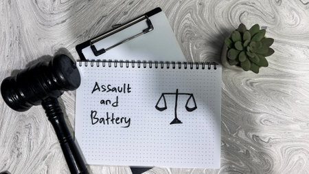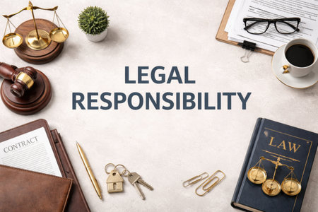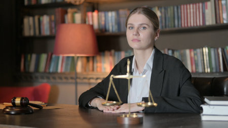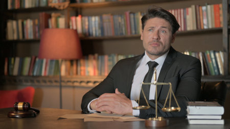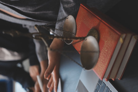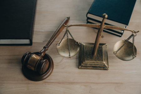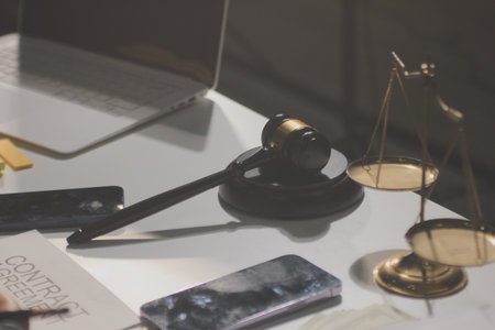 The workspace showcases legal items like scales, a gavel, papers, and coffee, emphasizing legal responsibilities and duties.