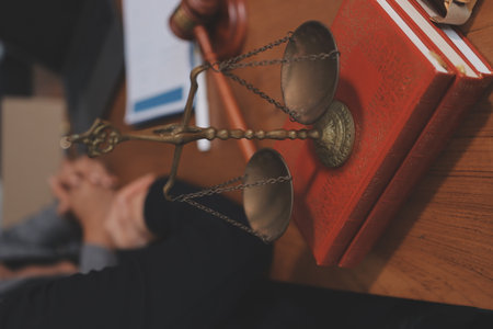 Business and lawyers discussing contract papers with brass scale on desk in office. Law, legal services, advice, justice and law concept picture with film grain effect