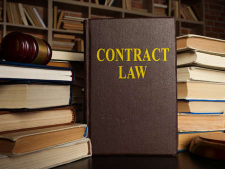 Contract law and pile of documents with gavel.