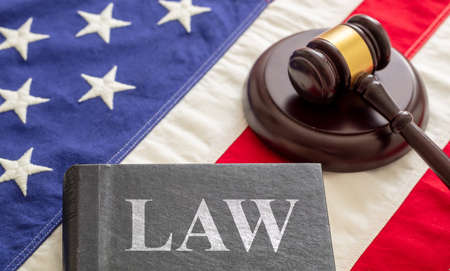 Law text on black book and judge gavel on US of America flag background. Justice in USA concept