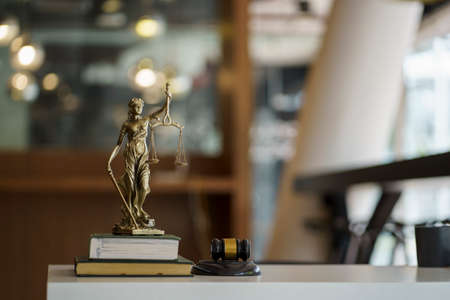 Law theme, mallet of the judge on wooden desk with Lady Justice Statue. Concept For Corruption, Justice, Law, Bankruptcy Court, Bail, Crime, Bribing, Fraud. Law gavel with handcuff and money