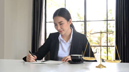 Female lawyers working with contract papers in the office and brass scale on white table.