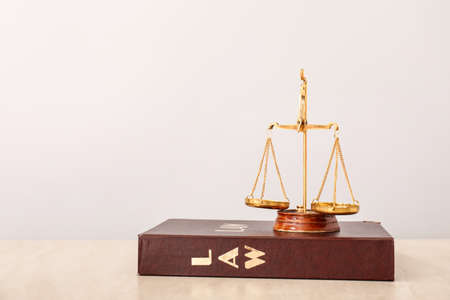 Scales of justice and book on table