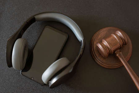 Judges gavel smartphone and headphones on black background. Top view. Music auction.