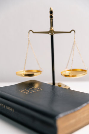Holy Bible, central book of Christian faith, details teachings of Jesus Christ, God's law, and principles of justice within religion. courthouse, equality, education, harmony, independence, worship