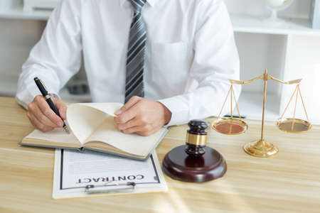 Law consultancy concept A male prosecutor reviewing his sentences of contract on his own notebook before writing them down on the contract paper