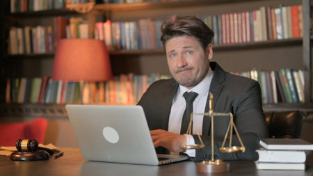 Male Lawyer in Denial Looking at Camera while Working on Laptop