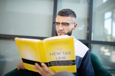Tax law book. Close up of smart businessman wearing glasses reading new tax law book