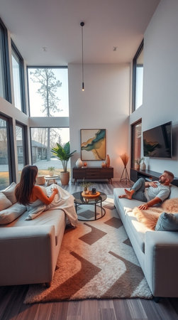 Attractive young couple relaxing on sofa in modern living room at home