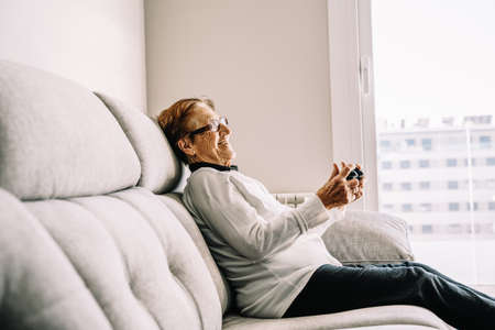 Side view of positive 90 year old female relaxing on couch at home with joystick and playing video game