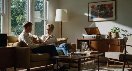 A bright airy interior friend window apartment sitting back view, two people share calm morning light beside houseplant and city skyline