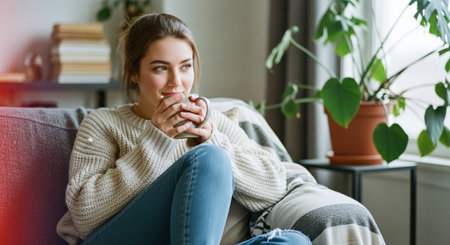 A relaxed woman enjoying a cup of coffee in a cozy living room