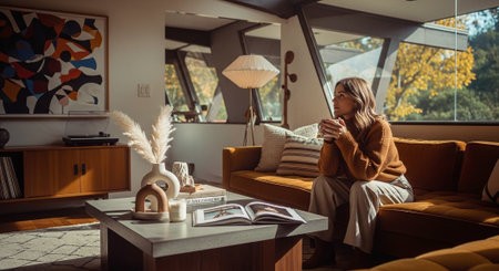 A woman relaxing in a cozy living room with a cup of coffee and a book
