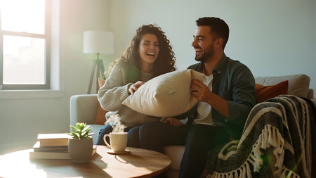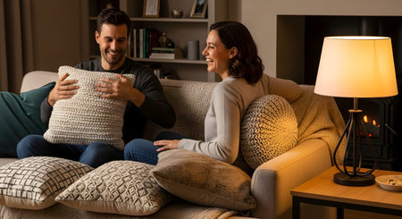 A cheerful couple sits on a beige sofa in a cozy living room, laughing and holding textured pillows. The warm lighting from a nearby lamp and a fireplace in the background sets a relaxed and romantic mood.
