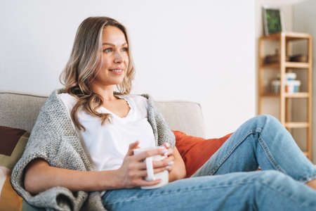Young beautiful woman forty year with blonde long curly hair in cozy knitted gray sweater with cup of tea in hands in bright interior at home