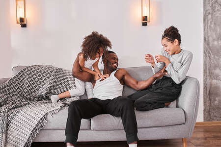 Father with little kids sitting on sofa in living room and having fun together