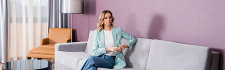 Young woman in casual clothes holding glass of wine on couch in hotel, banner