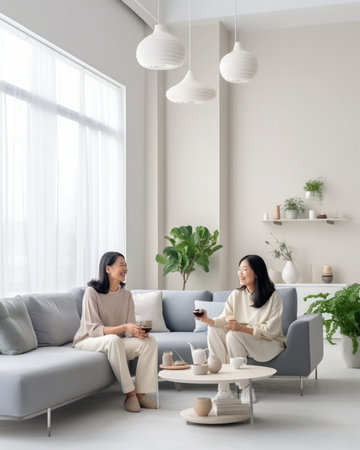 Three women are engaged in conversation within a well-lit, modern living room. The scene showcases neutral tones, natural textures, and a large abstract artwork. Soft lighting and comfortable seating suggest a relaxed atmosphere. This image could be used for lifestyle, design, or editorial content.