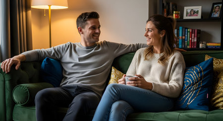 A happy young couple sitting comfortably on a green sofa in a modern living room. The woman is holding a mug, and they are looking at each other with smiles, engaged in a pleasant conversation.